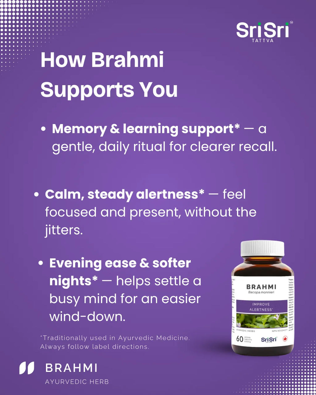 In Ayurveda, Brahmi (Bacopa monnieri) is cherished as a medhya rasayana—a rejuvenative for the mind—traditionally used to support memory, learning, and mental clarity, and to settle a busy mind for an easier evening.* Think of it as natural brain power you can build, day by day.