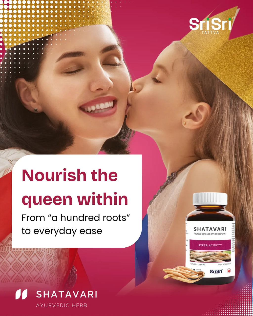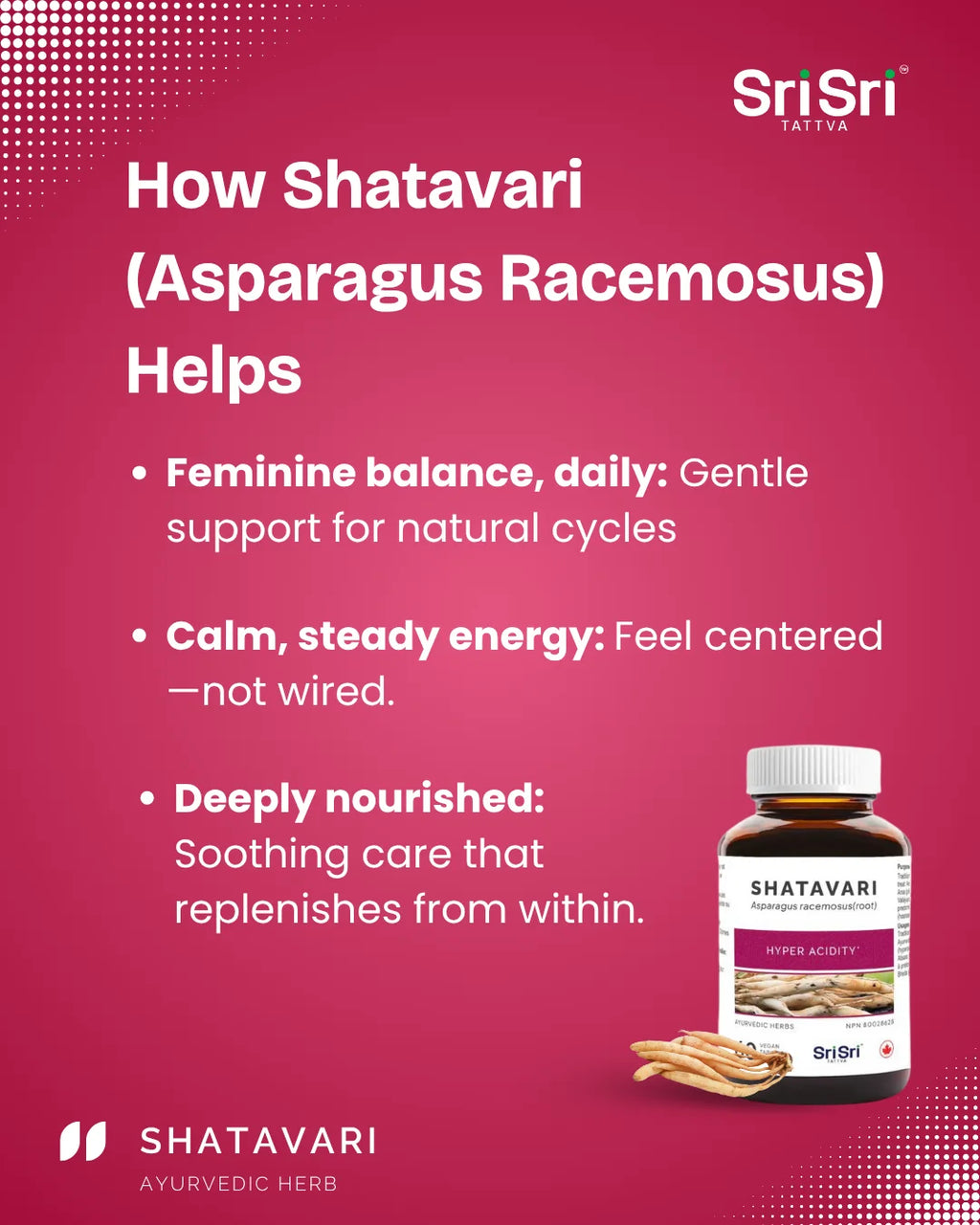 Shatavari (Asparagus racemosus)—literally translating to 'one hundred roots'—is revered as the Queen of Ayurvedic Herbs. It has been cherished for centuries as a vitalizing and grounding herb traditionally used to support feminine strength and inner harmony throughout all seasons of life.